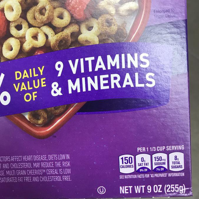 Multi Grain Cheerios | Whole Grain Oat Cereal | Cheerios Vitamins and Minerals: Calcium Carbonate, Iron and Zinc (mineral nutrients), A B Vitamin (niacinamide), Vitamin C (sodium ascorbate), A B Vitamin (calcium pantothenate), Vitamin B6 (pyridoxine hydrochloride), Vitamin B2 (riboflavin), Vitamin B1 (thiamin mononitrate), A B Vitamin (folic acid), Vitamin B12, Vitamin A (palmitate), Vitamin D3.