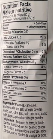 Kettle Cooked Sea Salt & Vinegar Potato Chips - MyFoodDiary Kettle Cooked Sea Salt & Vinegar Potato Chips Nutrition Facts Serving Size chips 18 chips = 28g Amount Per Serving 140 Calories % Daily Value* 11% Total Fat 7g 3% Saturated Fat 0.5g Trans Fat 0g 0% Cholesterol 0mg 10% Sodium 230mg 6% Total Carbohydrate 17g 4% Dietary Fiber 1g Total Sugars 0g 0% Includes 0g Added Sugars Protein 2g 0% Vitamin D 0mcg