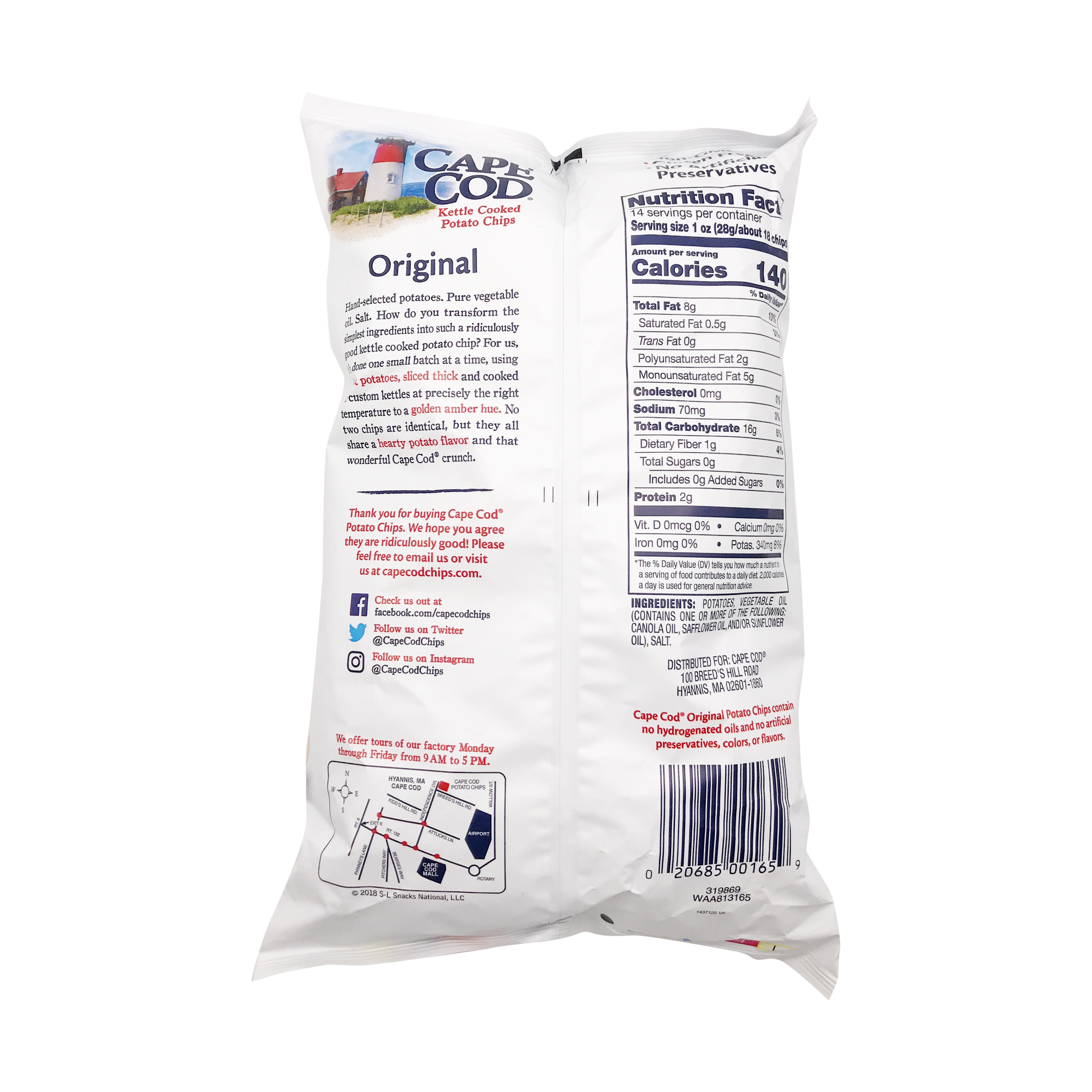 Calories in Cape Cod Original Potato Chips and Nutrition Facts - FatSecret There are 140 calories in 1 oz of Cape Cod Original Potato Chips. Get full nutrition facts for other Cape Cod products and all your other favorite brands. ... There are 140 calories in 1 oz of Cape Cod Original Potato Chips. Calorie breakdown: 49% fat, 46% carbs, 5% protein. ... Sensible Portions Garden Veggie Chips - Sea Salt & Vinegar: Simple ...