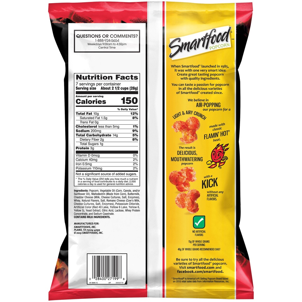 Smartfood Flamin Hot Popcorn W - Online Groceries | Safeway Flavored Popcorn. No artificial flavors. 15 g of whole grains per serving (48g of whole grains recommended daily). Gluten free. Flamin' hot white cheddar is here. Other snacks can go now. . SmartLabel: Scan for more food information or call 1-888-924-5654. Facebook. Instagram. (at)smartfoodpopcorn.