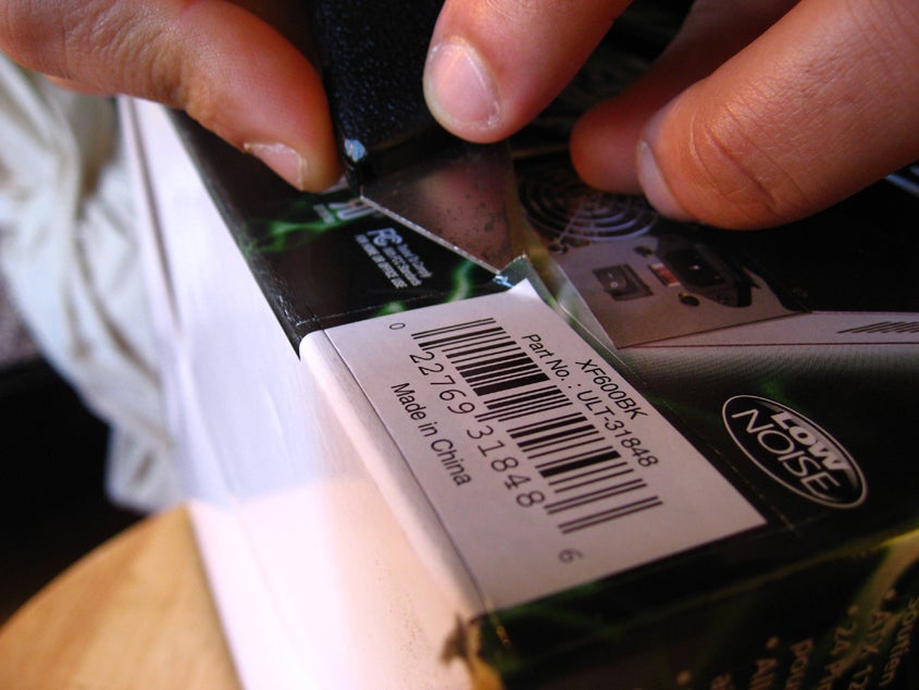 Easy UPC Symbol Removal for Your Mail-in Rebate Needs 1. box cutter/exacto knife/etc, 2. opposable thumb and index finger, 3. box with UPC symbol, Tip, Question, Comment, Step 1: Score Around the UPC Symbol, using your box cutter, make 4 cuts around each side of the UPC symbol, making sure they overlap at the corners. you need to press just hard enough to pierce the top layer of cardboard. Tip,