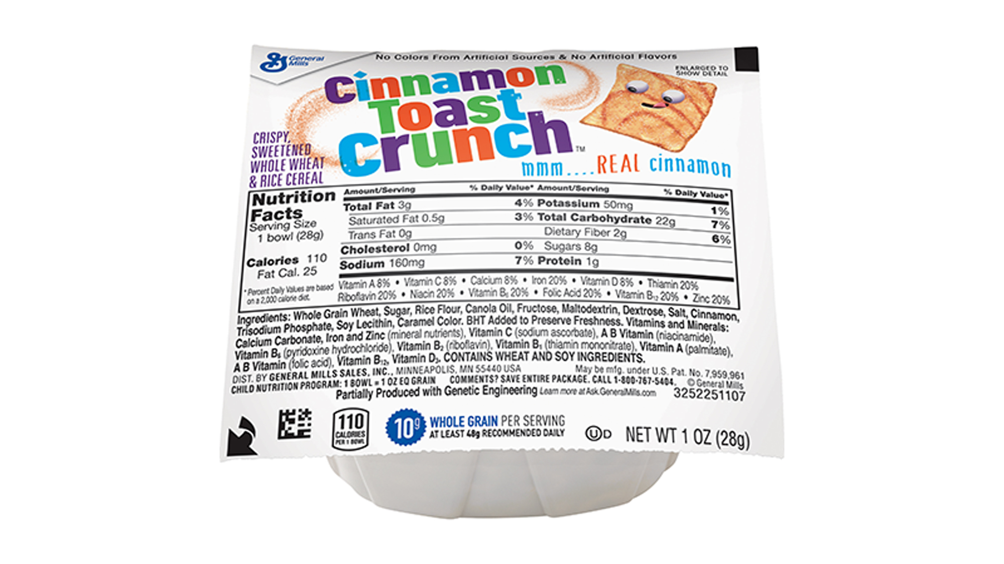 Cinnamon Toast Crunch Cereal | General Mills Cereal Discover the taste of Cinnamon Toast Crunch. Made with real cinnamon-sparkly goodness, this cereal is so delicious you'll want to crunch around the clock. ... Products; Promotions; Cinnamon Toast Crunch. Ingredients Nutrition Facts. Serving Size: Amount Per Serving As Packaged; Calories % Daily Value * * Percent Daily Values are based on a ...