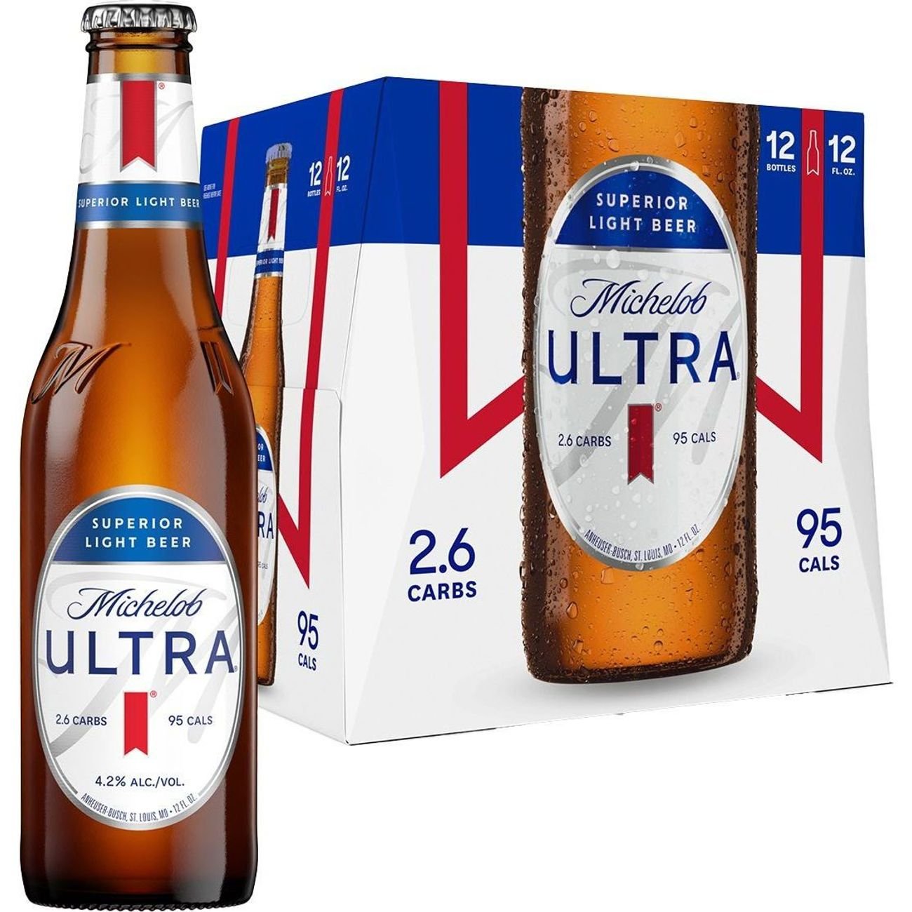 Michelob Ultra Beer 12 oz Bottles - Shop Beer at H-E-B Michelob ULTRA is the superior light beer. With just 95 calories and 2.6 carbs, you can enjoy the crisp, refreshing taste of Michelob ULTRA without compromising your active lifestyle. Nutrition and ingredients Nutrition Facts 12 servings per container Serving Size 12.00 fl oz Amount Per Serving Calories 95 % Daily Value * Total Fat 0g Nutrition Facts for Michelob ULTRA • MyFoodDiary® 4.2% ABV Alcohol 11.8g 0% Vitamin D 0mcg 1% Calcium 10mg 0% Iron 0mg 1% Potassium 60mg 0% Vitamin A 0mcg 0% Vitamin C 0mg * The % Daily Value (DV) tells you how much a nutrient in a serving of food contributes to a daily diet. 2,000 calories a day is used for general nutrition advice. 2.6 Net Carbs Per Serving Add to Food Diary Source of Calories