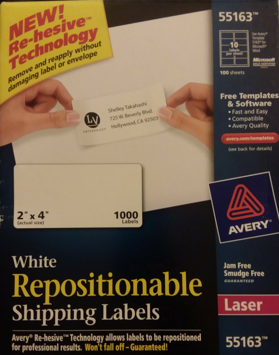 Avery 55163 Laser Labels, Shipping, 2-Inch X4-Inch, 1000/Bx, White Avery 55163 Laser Labels, Shipping, 2-Inch X4-Inch, 1000/Bx, White Brand: AVERY No reviews $4439 About this item Sold as 1000/Box. Labels can be removed and reapplied without damaging the label or envelope. The adhesive becomes permanent over time and is guaranteed not to fall off. Jam and smudge free guaranteed!