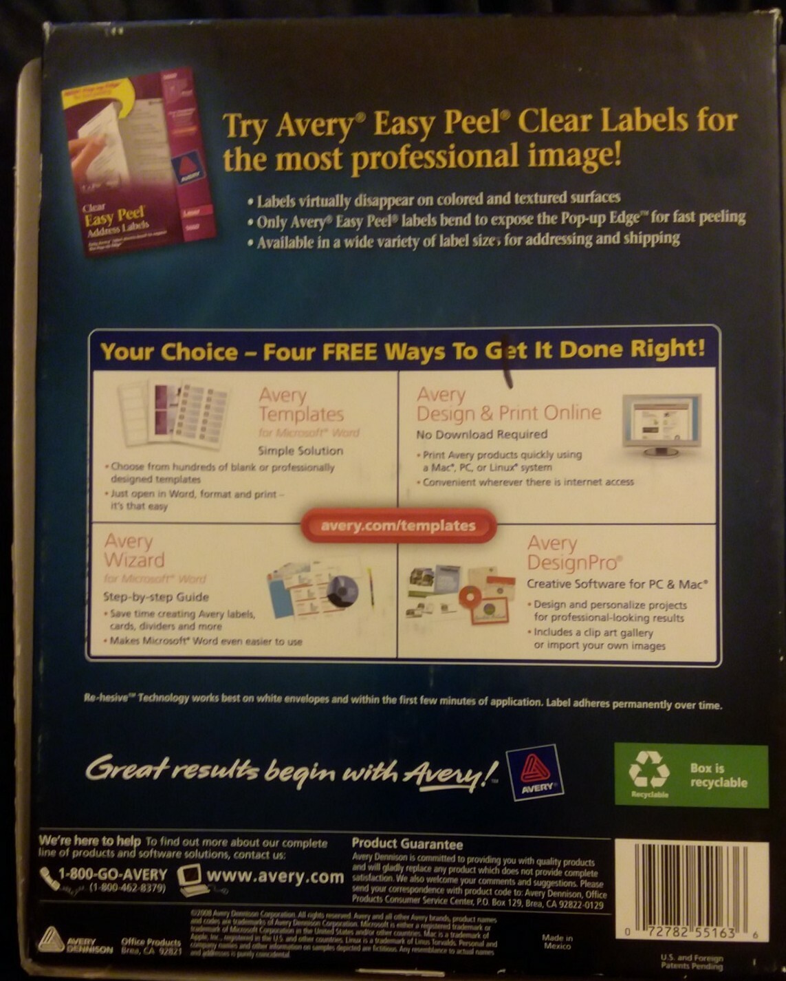 Avery By signing into your account , you agree to the Avery Terms of Service and Privacy Policy. - Office Depot Avery® Repositionable Shipping Labels With Sure Feed® Technology, 55613, Rectangle, 2" x 4", White, Pack Of 1,000 Item #979805 4.8 (4) + 7 More 1 / 10 Description Eco Conscious These bright white Repositionable Labels with Re-hesive Technology can be removed and reapplied without damaging the label or envelope. LABEL MLG REPO 10UP WH | Avery | AVE55163 Easy to customize with free templates and designs from Avery® Design & Print. 8 1/2" x 11" sheets. Item # : AVE55163 ; Price Alert ... Avery Avery. 100% Satisfaction Guaranteed. Fast Delivery. Free Shipping Over $50.