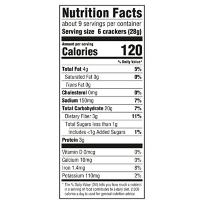 Triscuit, Original Nutrition Facts - Eat This Much For a Serving Size of 6 crackers ( 28 g) How many calories are in Triscuit, Original? Amount of calories in Triscuit, Original: Calories 120. Calories from Fat 31.5 ( 26.3 %) % Daily Value *. How much fat is in Triscuit, Original? Amount of fat in Triscuit, Original: Total Fat 3.5g. Calories in Triscuit Balsamic Vinegar & Basil and Nutrition Facts There are 120 calories in 6 crackers (28 g) of Triscuit Balsamic Vinegar & Basil. Calorie breakdown: 26% fat , 65% carbs, 10% protein. Related Crackers from Triscuit: Calories in Triscuit (Nabisco) Crackers, Dill Sea Salt & Olive Oil,100% ... There are 120 calories in 1 6 crackers (1 oz) of Triscuit (Nabisco) Crackers, Dill Sea Salt & Olive Oil,100% Whole Grain Wheat. You'd need to walk 33 minutes to burn 120 calories. Visit CalorieKing to see calorie count and nutrient data for all portion sizes. Calories in Triscuit Crackers Original and Nutrition Facts There are 120 calories in 6 crackers (28 g) of Triscuit Crackers Original. Calorie breakdown: 26% fat, 65% carbs, 10% protein. Related Crackers from Triscuit: Sweet Potato & Roasted Onion Basil & Garlic Tzatziki Crackers Thin Crisps Chile Pepper Thin Crisps Four Cheese Balsamic Vinegar & Basil find more triscuit crackers products